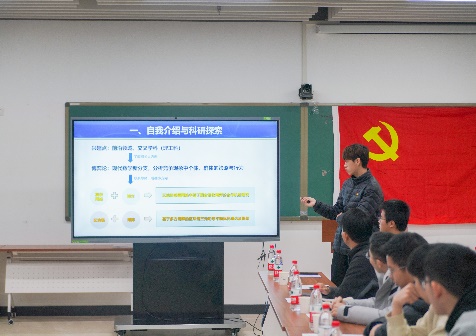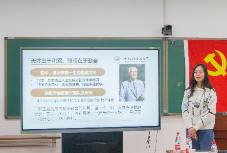 周星汝、王浩然、徐晓东、王菲帆等四名同学进行分享。周星汝以“赓续大师精神 砥砺奋斗青春”为题,回顾了“人民数学家”华罗庚先生的人生历程,领略了华老爱国精神、自强精神、人梯精神和奉献精神。王浩然以“空天报国 勇担强基使命”为题,结合具体实例分享了自己所认识的数学美、数学趣;徐晓东以“夯实基础 氤氲数学文化”为题,分享了自己对于数学文化的认识;王菲帆以“科技报国 致用应用前沿”为题,结合自身大创科研经历,表达了学以致用的决心。