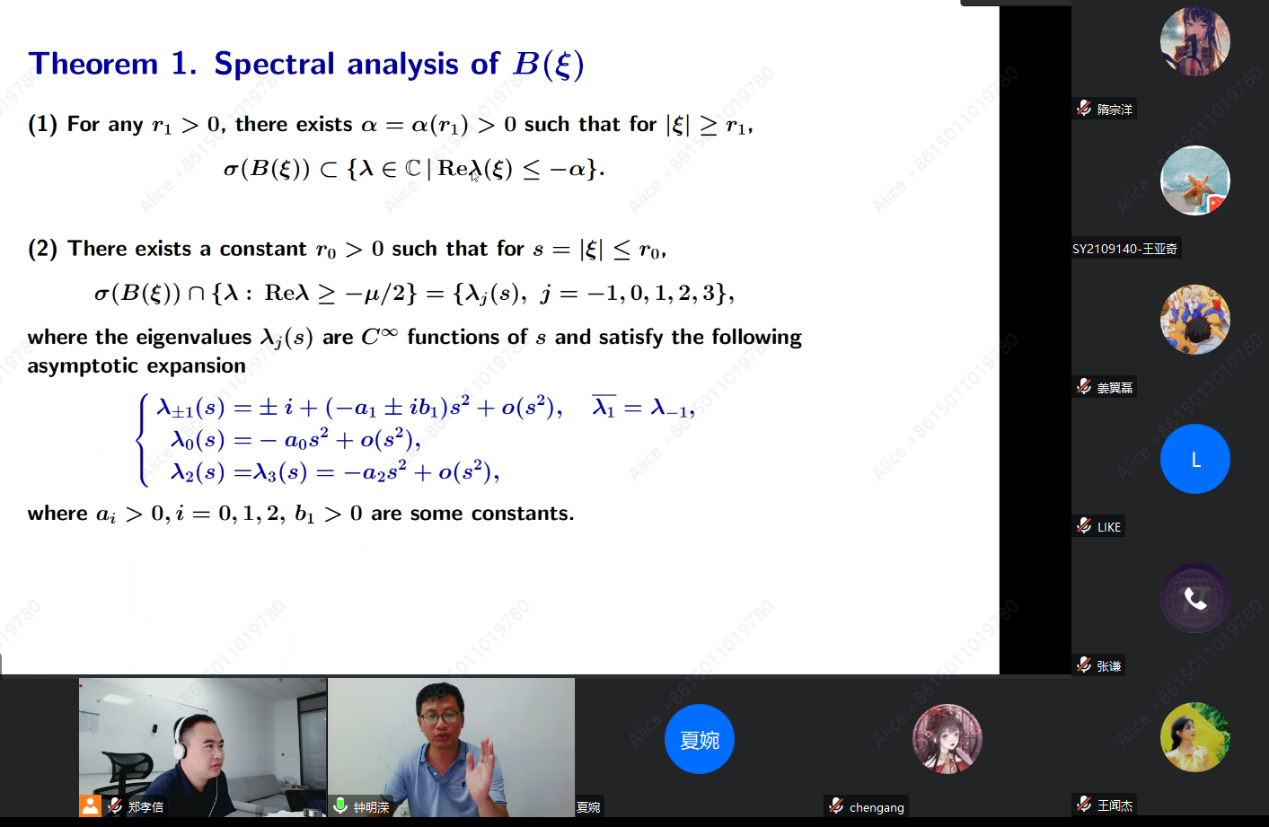 通过宏观和微观分解,钟教授围绕Vlasov-Poisson-Boltzmann方程线性系统的柯西问题,对相应算子的谱进行了在不同尺度下的归纳分析。 在此基础上,给出了Vlasov-Poisson-Boltzmann方程平衡解的最优时间衰减率,成功解决了该领域的一个公开问题。在报告过程中,钟教授详细讲解了谱方法在解决问题中的整个历程,对我们后续科研工作有很大的借鉴和促进作用。