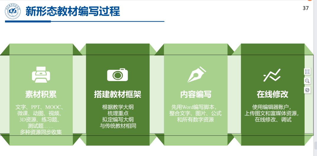 科技出版中心副主任,理工图书分社社长蔡喆老师围绕新形态教材建设进行了介绍。她从教学改革和技术进步的历程,介绍了教材的发展过程,分析了新形态教材的基本特征。蔡老师结合北航出版社云教材建设的具体案例,从素材积累、框架搭建、内容编写到在线使用等介绍了一本云教材的产生过程。