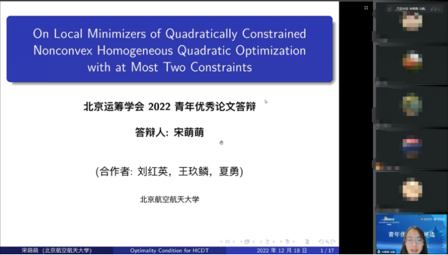 2022年12月18日,在北京运筹学会2022年学术年会上,sunbet申搏2020级博士生宋萌萌的参评论文“On Local Minimizers of Nonconvex Homogeneous Quadratically Constrained Quadratic Optimization with at Most Two Constraints”荣获“北京运筹学会青年优秀科技论文”奖。该奖项是由北京运筹学会组织设立,每年评选一次,旨在奖励北京地区青年学者在运筹学领域做出创新性成果的科技论文。自2021年起分教师和员工两个组别。宋萌萌同学是2022年度员工组的唯一获奖人。