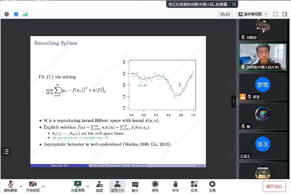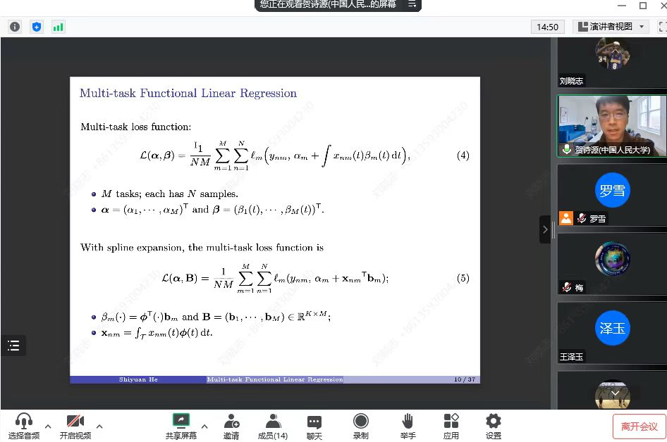2022年11月18日,中国人民大学统计与大数据研究院贺诗源老师应罗雪老师的邀请,通过线上的方式为sunbet申搏师生带来了一场题为“A Unified Analysis of Multi-task Functional Linear Regression Models with Manifold Constraint and Composite Quadratic Penalty”的学术报告。