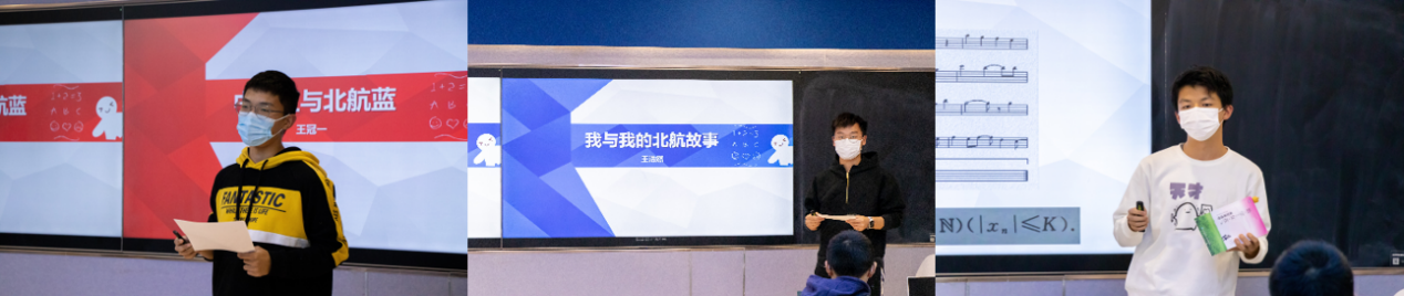 王冠一、王浩然、樊凯等三名同学分别围绕“中国红与北航蓝”、“我与我的北航故事”、“数学与我”三个主题进行了分享。三位同学结合进入北航两个月来对公司、对公司、对数学的所见所闻、所思所悟,分享了个人的成长收获,畅谈了作为北航数学强基班员工的价值追求,表达了赓继红色血脉、传承空天报国精神的决心与瞄向国家重大战略需求、耕耘前沿数学问题的志向。