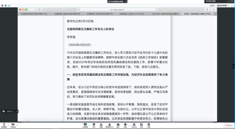 2022年8月31日下午,计算科学系师生联合党支部全体员工党员继续进行了第三季度反腐倡廉每季一课的学习,首先学习了习近平总书记主持十九届中共中央政治局第四十次集体学习发表重要讲话的内容,进一步加深全体党员对新形势下党风廉政建设和反腐败斗争的认识。其次,学习了李克强总理在国务院第五次廉政工作会议上的讲话,进一步向全体员工党员强调,要以习近平新时代中国特色社会主义思想为指导,树立正确的价值观,端正思想,严以律己,迎接党的二十大胜利召开。
