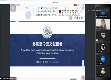 7月2日下午,夏令营邀请了牟晨琪、郑孝信两位新晋博导为营员们做学术报告。牟晨琪老师在报告《多项式方程组求解及其应用》中介绍了计算机代数以及计算代数交叉学科等前沿问题,郑孝信老师从应用数学领域未来可以选择的研究方向、应用数学的特点和应用数学的研究方法三个方面展开介绍。两场报告内容丰富,角度各异,打开了营员们的学术视野,赢得了营员们的好评,也更坚定了学习数学、继续深造的志向。随后部分研究生导师及团队分别进行宣讲,各团队导师向同学们介绍了各自的研究方向、团队成员、科研成果和发展状况等,并留下了联系方式,欢迎同学们在暑期进行更深入的互动交流,报告会在参会师生的互动交流中圆满结束。