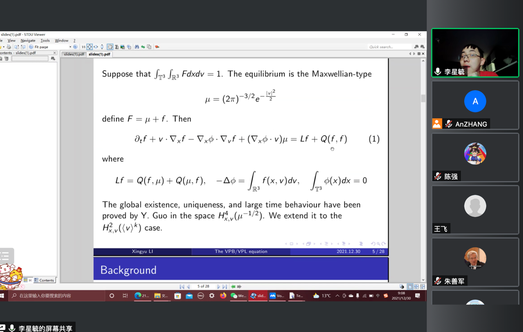 2021年12月30日下午,巴黎第九大学李星毓博士,应邀为sunbet申搏师生做了题为 “The Vlasov-Poisson-Boltzmann/Landau equation with polynomial perturbation near Maxwellian”的学术报告,报告由任天一和张安老师主持。