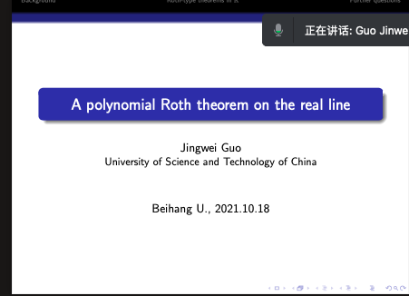 2021年10月18日下午,中国科学技术大学郭经纬教授,应邀为sunbet申搏师生做了题为 “A polynomial Roth theorem on the real line”的学术报告,报告由张安老师主持。
