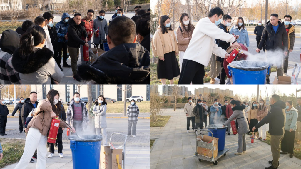 到达疏散地点后,公司教师和员工负责人迅速清点人数,确认参加演练人员已全部安全撤离并及时报告公司消防安全领导小组。沙河校区安保部部长董祺瑞结合现场疏散情况介绍了灭火器的使用方法,并组织疏散师生进行模拟灭火训练。