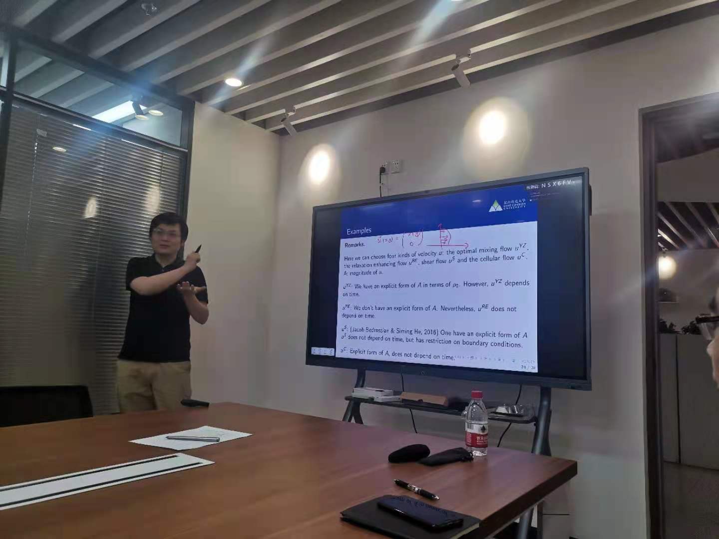Keller-Sege方程是描述生物和化学吸力的重要物理模型。在supercritical mass 的情形,方程的解会在有限时间collapse. 本报告中,徐老师首先回顾了这类问题的物理背景,进一步研究化学趋性和流体运输过程的相互影响,通过增加advection项来模拟外界环境流体的作用,最终证明了流体项的出现可以解决奇异性的困难,从而得到整体的解的存在性和收敛性。最后,徐老师还介绍讨论了几种流的防爆破性能。