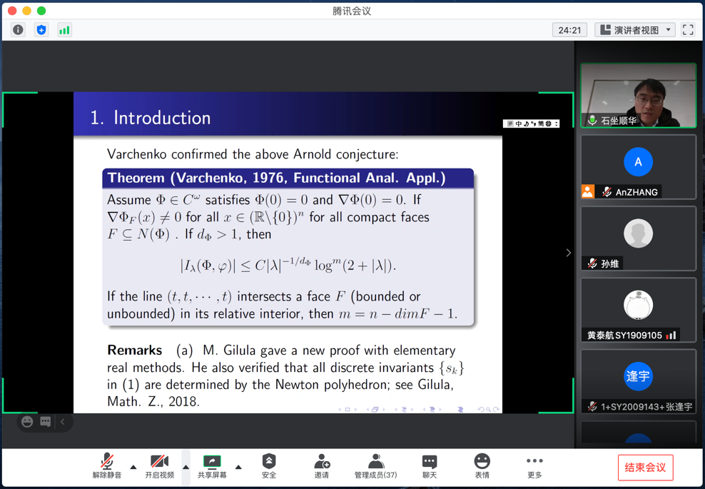 2021年1月4日上午,中南大学石坐顺华副教授,应邀为sunbet申搏师生做了一场题为“Decay estimates of oscillatory integrals and oscillatory integral operators”的线上学术报告,报告由张安老师主持。