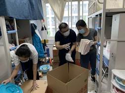 志愿服务队分成9组开展工作,各组老师与员工们直播打包全过程,包括物品的收纳情况,易碎易坏物品的放置情况,同时反复确认重要文件和证书的和归置情况。直播气氛轻松愉快,尽管隔屏相望,“这个很珍贵,给你包好放在箱子里”“谢谢老师”“这个确定不要吗?这还有空给你装上吧”“老师辛苦了”,始终回响在各个宿舍中。