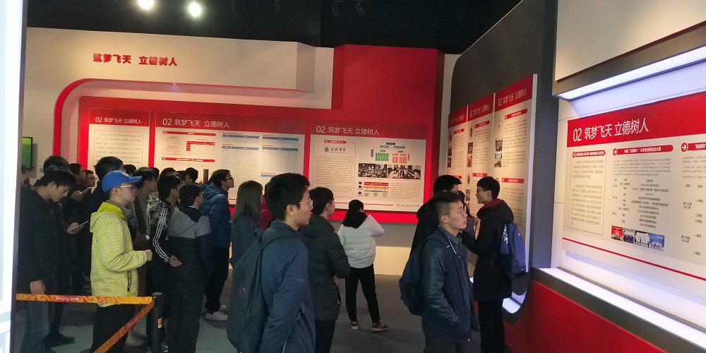 最后,同学们来到了“砥砺奋进,空天报国“——五年成就展。”五年成就展“集中展示了党的十八大以来,北航人不忘初心,跨越发展的五年,总结了五年来北航在团队建设、人才培养、人才引育、科研创新、国际交流合作、民生、党建等方面的历史成就。同学们领略到北航灿烂的成就,体会到数十载北航人艰苦奋斗精神的传承。