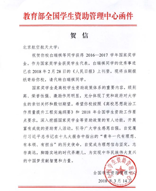 为激励青年员工坚定理想信念,志存高远、脚踏实地,勇做时代的弄潮儿,教育部全国员工资助管理中心从各省(自治区、直辖市)和各高校推荐的2017年国家奖学金获奖员工代表中遴选出100名优秀典型代表,公司白瑞祺同学当选,《人民日报》于2018年2月28日版刊登了白瑞祺同学优秀事迹。