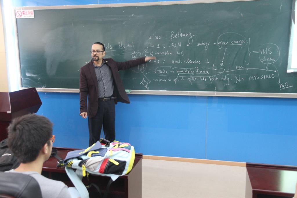 Lima-Filho教授首先向同学们展示了美国德克萨斯A&M大学理公司(TAMU Science Department)近年来的办学及发展概况,并详细介绍了理公司各个数学专业方向的人才培养计划包括各类专业所修的课程清单及未来就业方向。接下来他为大家介绍了“BUAA- TAMU数学专业本科生快车道”这一国际交换项目的具体情况,即在北航数学公司完成前三年的学业后申请去TAMU继续读一年的graduate和undergraduate混合的课程,然后由员工学习情况决定在接下来的一年内读完Master Degree或是直接去攻读PHD。接下来的互动交流环节中,同学们就当前关心的申请问题以及未来规划向Lima-Filho教授踊跃提问,教授清晰亲切的一一作答也解答了同学们心中存在的疑虑。此次座谈会进一步推进了公司与美国德克萨斯A&M大学的沟通,也为2015年华罗庚班的国际交流计划的实施拉开序幕。