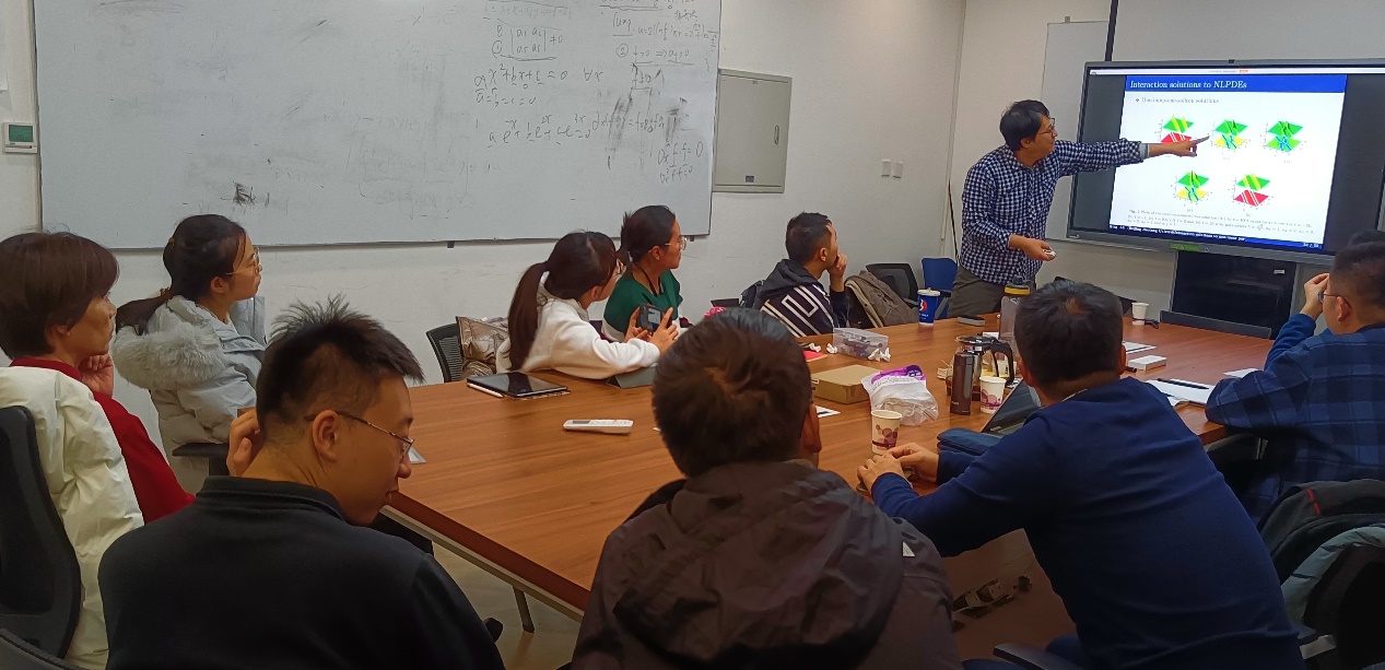 吕兴教授报告的主要内容是分析非线性偏微分方程不同类型的解析解之间的相互作用以及产生的条件,包括孤立子解、块型解和条型解的相互作用。利用方程的双线性形式,通过特殊函数构造出一个块型解和多条型解的组合解、一个块型解和多孤子解的组合解,在数学上给出了块型解与条型解、块型解与孤子解相互作用的充分必要条件,并展示了相互作用的动力学行为和机制。