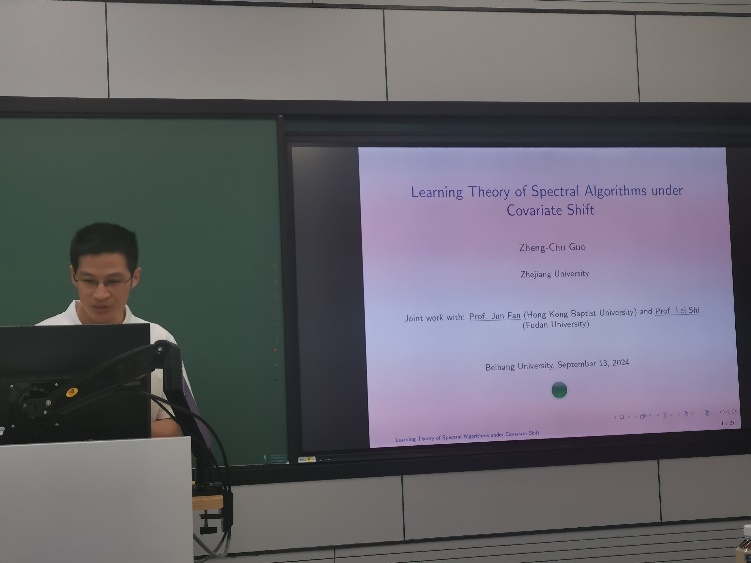 郭正初教授的报告题目为“Learning theory of spectral algorithms under covariate shift”。在机器学习中,人们通常认为训练样本和测试样本都来自于相同的底层分布。然而,这种假设在实践中可能并不总是正确的。在这次报告中郭教授介绍了他与合作者的深入研究,考虑其中输入变量(也称为协变量)的分布在训练阶段和测试阶段是不同的,即协变量移位。为了解决协变量偏移所带来的挑战,报告特别关注加权光谱算法。在温和的条件下,该算法能达到令人满意的收敛速度。